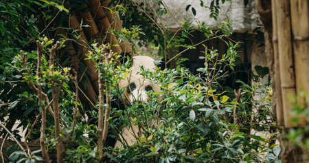 A panda gazes curiously amid vibrant bamboo foliage, showing its playful nature in a tranquil environment. Perfect for relaxation.