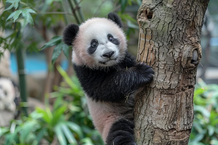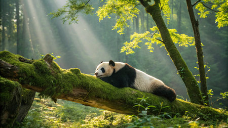 Charming panda bear clings to tree in verdant forest setting evoking a sense of peace Perfect for wildlife and conservation content.