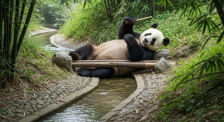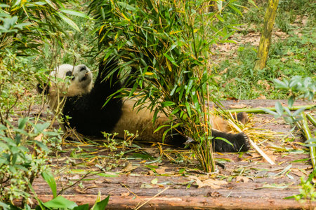A charming panda bear is seen enjoying a bundle of bamboo in a vibrant green forest. This close-up shot captures the animal's playful and serene demeanor, showcasing the beauty of wildlife in its natural habitat. Perfect for nature lovers and wildlife photography enthusiasts.