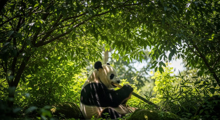 Giant panda eating bamboo in a lush green forest generative ai