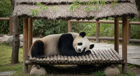 Giant panda bear curled up and sleeping under the shade of bamboo trees in a zoo. An endearing sight for animal-themed content.