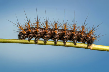 A detailed macro photograph captures a dark brown caterpillar with numerous sharp, golden-tipped spines crawling along a slender green stem against a soft blue sky.