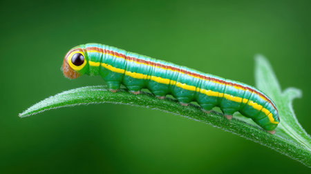 A close-up of a caterpillar munching on a green leaf, with vibrant colors and textures, showcasing the life cycle of insects and their role in nature.
