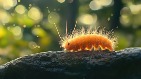 A striking close-up of a vibrant orange caterpillar crawling over a rock, set against a beautifully blurred natural background, embodies the richness of wildlife.