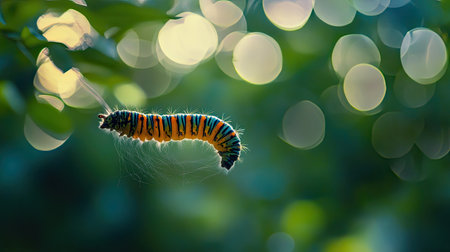 A vibrant caterpillar delicately hangs from a leaf, surrounded by a soft bokeh effect. This close-up captures the essence of nature's beauty and transformation.