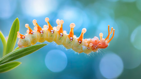 A striking and vibrant caterpillar gently crawls on a bright green stem, set against a softly blurred bokeh background. Ideal for nature lovers.