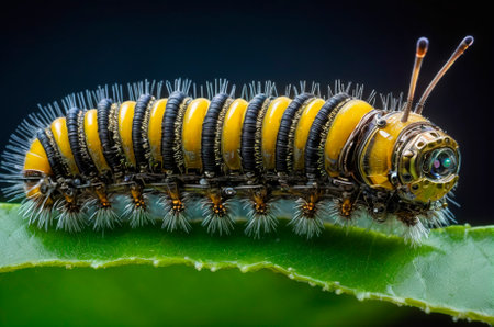 Cybernetic caterpillar, highly detailed macro photography. Generative AI.