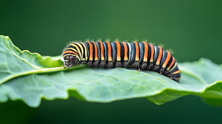 A vibrant caterpillar with striking colors rests on a lush green leaf. This close-up captures the beauty of nature and the intricate details of wildlife.