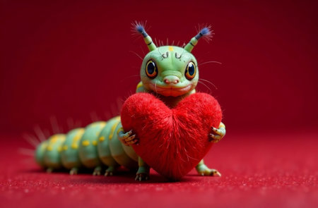 AI Generative Valentine's Day card, caterpillar holding fluffy heart on red background