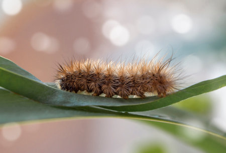 Colorful spined caterpillar with complex textures captured in macro on a branch, natural bokeh in background