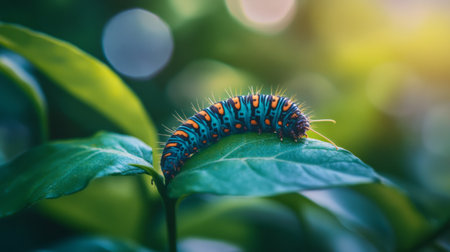 A whimsical shot of a caterpillar crawling on a vibrant green leaf, with blurred background foliage, emphasizing the life cycle and transformation of butterflies.