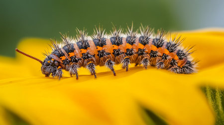 A colorful caterpillar with orange and black spines crawls on a bright yellow flower petal. This macro shot showcases intricate details of nature's beauty.