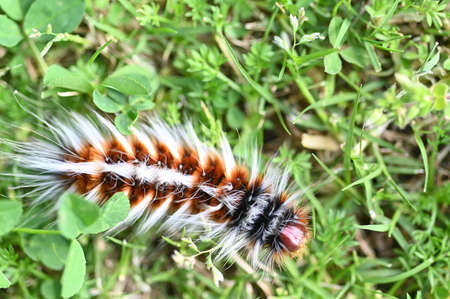 Above view of Anthelid acuta moth caterpillar crawling on green garden grass.