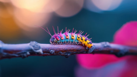 A bright blue and yellow caterpillar delicately crawls along a thin branch, showcasing intricate details against a dreamy blurred background, revealing the beauty of nature.