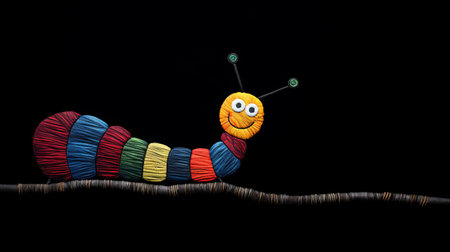 a brightly coloured worm hangs from a branch in this black background photo. the childlike wonder of the scene is enhanced by the humorous tableau created by the worm's presence. the carpetpunk aesthetic is evident in the layered fibers and hand-painted details, reminiscent of dansaekhwa art. ai generated
