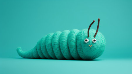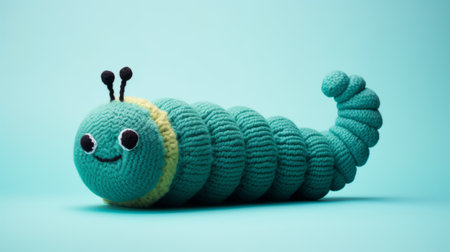a green plastic worm, resembling a plush doll, is showcased on a vibrant blue background. created using cinema4d, this unique artwork combines elements of knitting and crocheting. the image features minimal retouching and is presented in ultra-high definition. with its quirky character designs, the worm stands out against the light gray and turquoise color scheme. ai generated