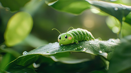 This delightful image features a cute cartoon caterpillar perched on a vibrant green leaf, capturing a sense of playfulness and natural beauty. The cheerful character embodies the essence of life and transformation in nature.