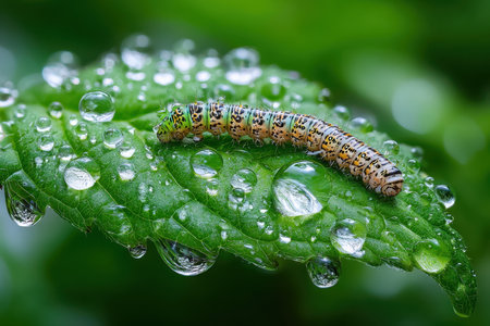 A vibrant green caterpillar rests on a leaf, adorned with glistening water droplets. This macro shot captures the beauty of nature's tiny creatures in a serene environment.