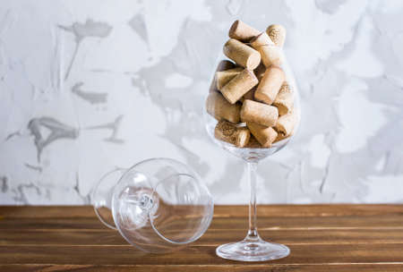 Many wine corks in a glass goblet. Copy space