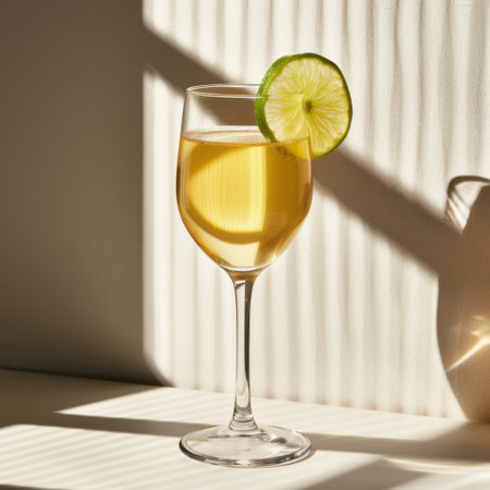 A vibrant yellow citrus drink garnished with a lime slice, bathed in soft sunlight, creating a refreshing and inviting ambiance perfect for any gathering.