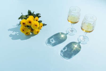 Two glasses of white wine on a white background with shadows. Copy space.