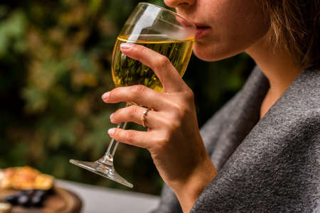 Drinking cold white wine with friends on outdoor terrace, summer vacation, close up