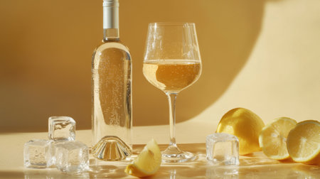 A bottle of white wine with condensation, sitting next to a glass filled with wine, surrounded by ice cubes and lemon wedges.