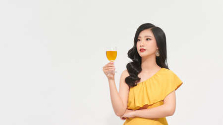 beauty cheerful girl in yellow dress posing in studio on white background