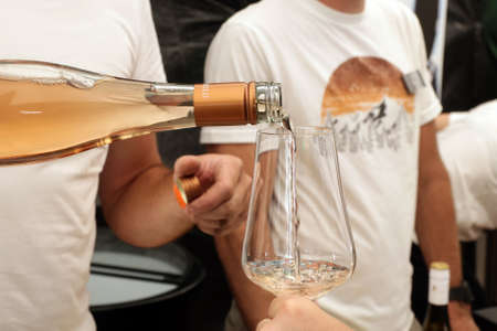 Serving of white wine to the customer in the restaurant Focus is at the bottle and glass : Generative AI