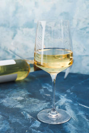 Image of white wine glass with white wine bottle on wooden table with blurry background