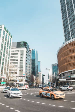 Big city view with skyscrapers. Cityscape view in the metropolis. Street with cars and taxi in the big city. Busy day in Seul.