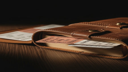 Cinematic low angle shot of a heavily worn leather travel journal with vintage train tickets protrud