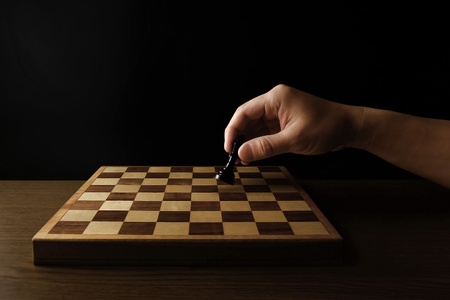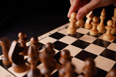 Close up of white and black wooden chess pieces on board. Woman's hand makes first move of white pawn on chessboard. Concept of intelligent, logical and strategic game