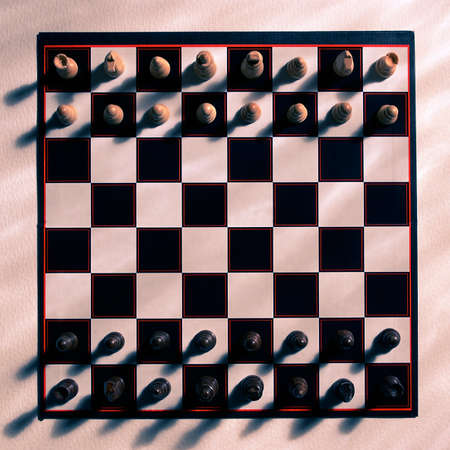 A chess board and black and white chess pieces on a wooden table, close-up, selective focus