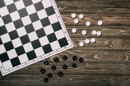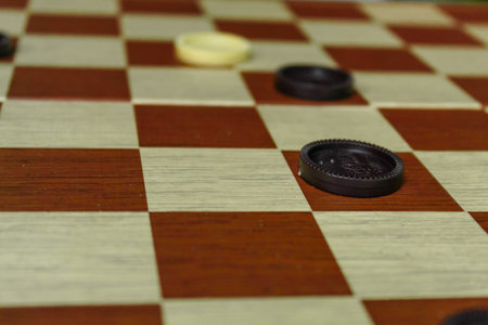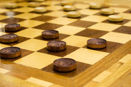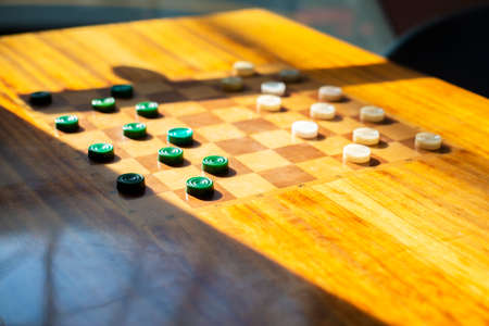 A board for playing checkers with chips on a wooden table, close-up, selective focus