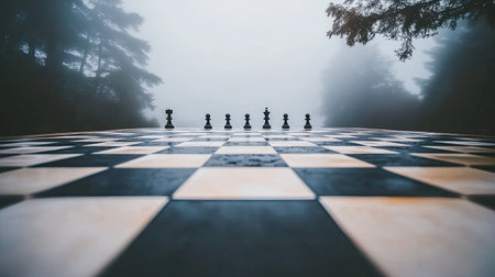 A captivating image of a chessboard shrouded in mist, featuring pawns lined up against a serene backdrop of trees, inspiring thoughts of strategy and calm.