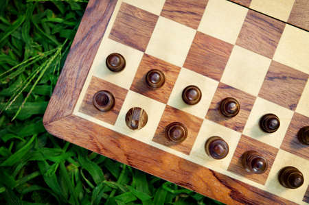 Sports or recreation Board game board with checkers. Hobby. Checkers on the playing field for the game.