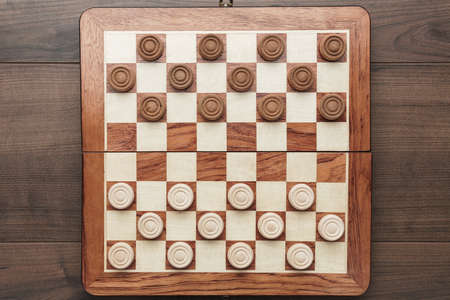 Checkers in checkerboard ready for playing. Game concept. Board game. Hobby. checkers on the playing field for a game.