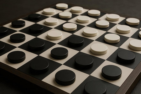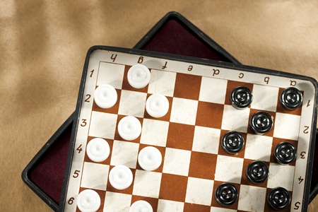 Checkers. Draught board. Direct conflict between white and brown pieces.