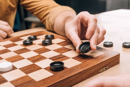 Game of checkers. Close up footage of player make his turn with black chip on black background.