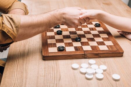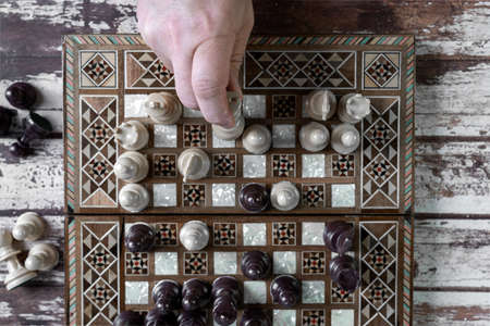 Top view of a hand playing chess game on old peeled of colored wooden table