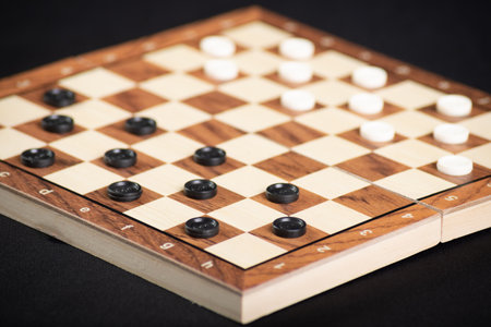 Checkerboard with checkers. Game concepts. Board game. Hobby. Checkers on the playing field for a game. On black background.