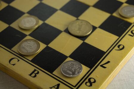 Ukrainian hryvnia and Russian rubles lie on a chessboard, sanctions in Russia, finance and economics