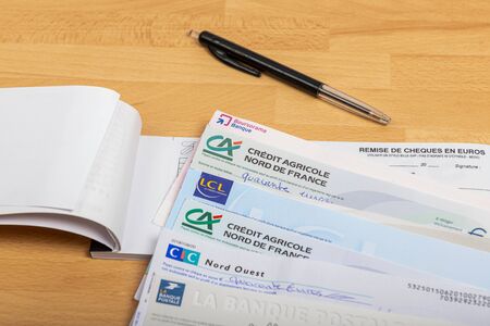 Paris, France - November 18, 2019 : Checks of different french banks set on a wooden desk. France is the European country where checks are most used