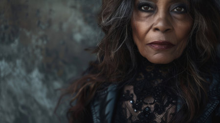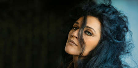 Mysterious woman with dark hair and makeup in a dramatic setting