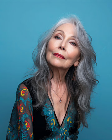 an older woman with gray hair posing against a blue background