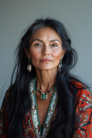 Portrait of Mature Woman with Long Hair and Ethnic Jewelry in Traditional Attire