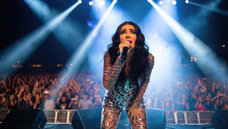 A popular singer captivates the audience at a lively outdoor concert, showcasing a stunning performance with colorful lights illuminating the night. The crowd is engaged and cheering.