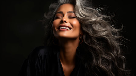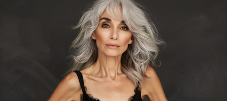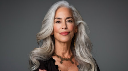 Elegant woman with long, flowing silver hair, wearing black outfit and statement necklace. She exudes confidence and grace, showcasing timeless beauty and sophistication