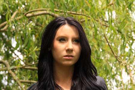 Attractive dark-haired young woman posing in front of a Willow tree